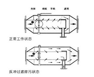 手動蝶閥開啟,即閥板平面與筒體軸線平行,(此時扳手亦與筒體軸線平行)排污閥關(guān)閉。此時水流從進口直接進入過濾網(wǎng)筒內(nèi)部,經(jīng)濾網(wǎng)過濾后由出口排出。2、反沖洗工作狀態(tài)