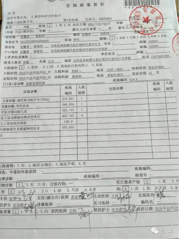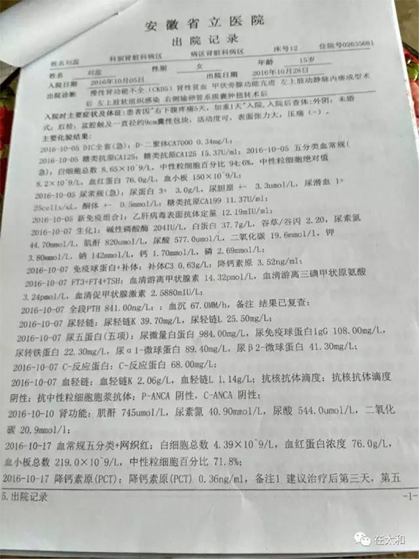 2016年3月7號的清晨,一向聽話乖巧的大女兒蕊蕊沒有像往常一樣早起上學(xué),而是打電話給我說自己肚子很痛,我急忙趕去帶著蕊蕊去了太和縣人民醫(yī)院,經(jīng)過一番診斷和系統(tǒng)的檢查,最后診斷是卵巢囊腫??删彤?dāng)一切都安排好了,蕊蕊也可以手術(shù)的時(shí)候,噩耗再次傳來,術(shù)前檢查發(fā)現(xiàn)蕊蕊的肌酐高達(dá)600多,已經(jīng)需要透析治療。直到現(xiàn)在依然無法接受,才十五歲的女孩,竟然患上了尿毒癥。