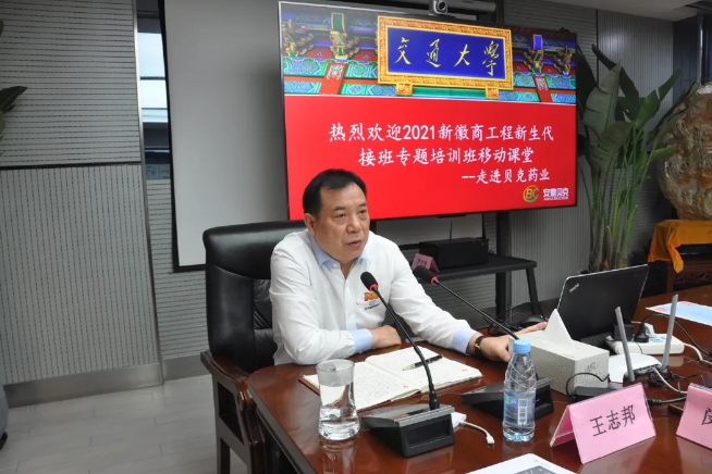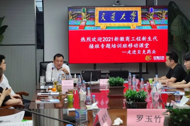 本次移動課堂由上海交通大學安泰經(jīng)濟與管理學院教授羅守貴,上海交通大學國際電子商務客座教授傅志勇致專題講座,貝克集團董事長王志邦受邀就《傳承徽商精神》進行主題分享,貝克原料藥基地常務副總王猛,貝金基因總經(jīng)理王倩倩,貝克集團總裁助理陳小峰參加研修班交流活動。