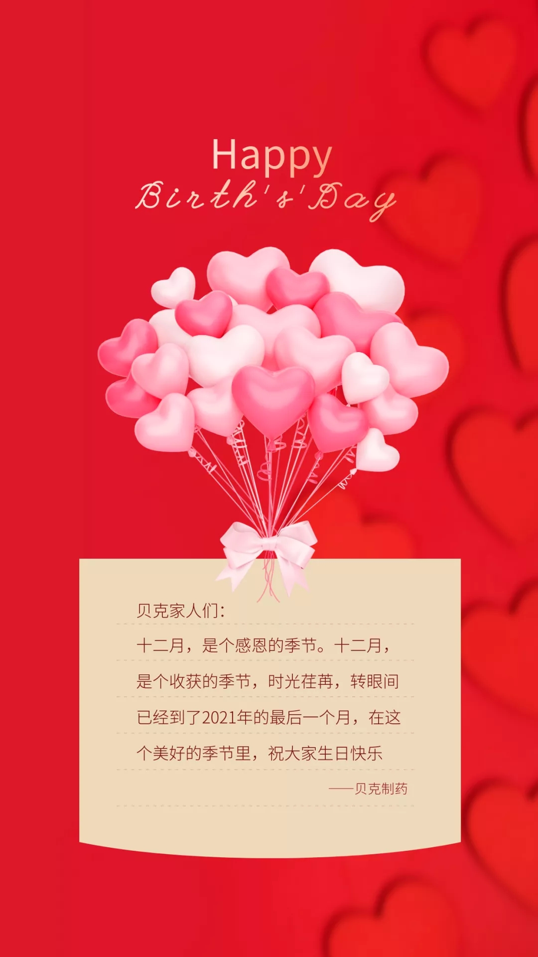 “以人為本”是一個現(xiàn)代企業(yè)文化的核心競爭力,優(yōu)秀的企業(yè)應該具有內(nèi)涵豐富、底蘊深厚的企業(yè)文化。貝克制藥每月舉辦的生日會就是體現(xiàn)公司人文關懷的一種舉措,相信通過這個有意義的活動,可以讓每一個貝克人都能感受到公司的深情關懷,感受到這個集體的溫暖和幸福。精美的賀卡和生日福利卡是公司送給大家最真摯的祝福、最貼心的關懷。